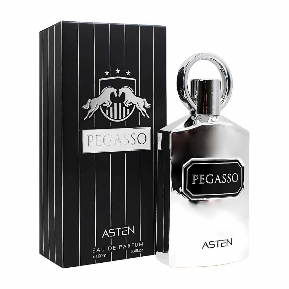 Asten Pegasso EDP 100 ml es una fragancia masculina con un carácter amaderado y especiado que transmite elegancia y seguridad. Inspiración de Pegasus de la casa de lujo Parfums de Marly. Perfecta para uso nocturno en estaciones frías como otoño e invierno, esta esencia está diseñada para destacar con fuerza y estilo.