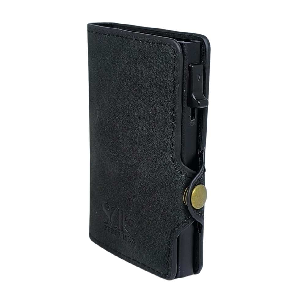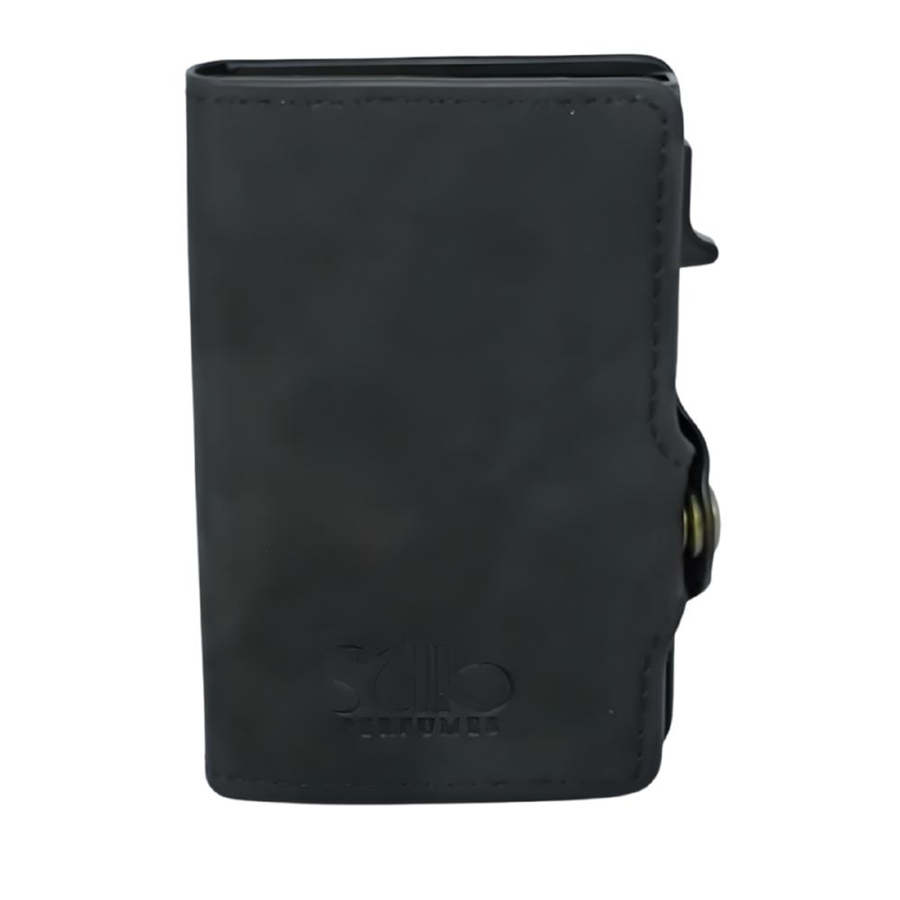 Diseñada para practicidad y estilo, esta billetera tarjetero en color negro ofrece espacio para tarjetas y billetes en un formato delgado y elegante ideal para uso diario.