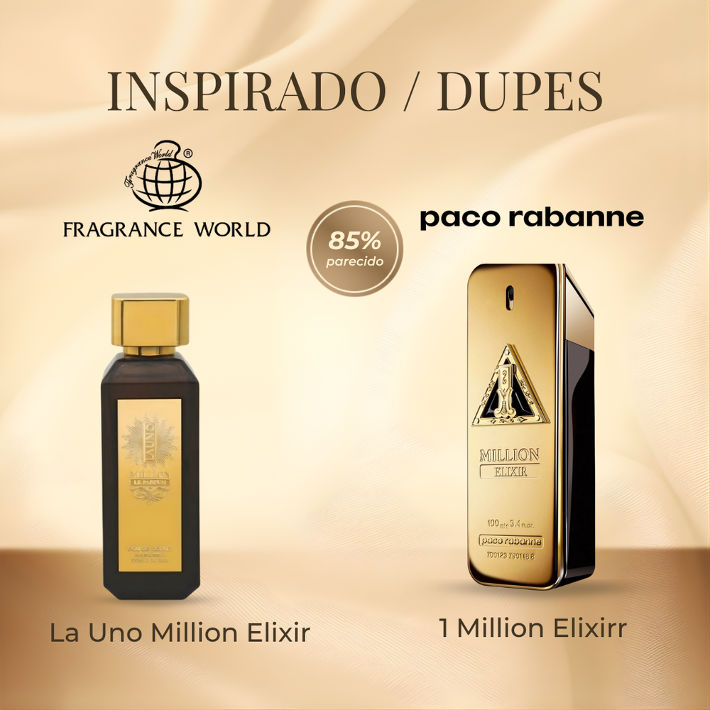 Fragrance World La Uno Million Elixir EDP 50 ml es una fragancia intensa y seductora que combina notas dulces y especiadas con un fondo cálido y envolvente, ideal para quienes buscan destacar con elegancia. Inspirado en 1 Million Elixir, ofrece una estela profunda y moderna perfecta para noches especiales y momentos memorables.