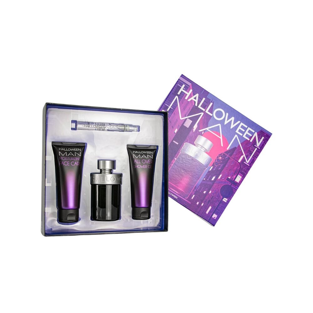 Halloween Man de Jesús del Pozo es una fragancia masculina misteriosa y seductora, con una mezcla oriental y especiada. Se abre con martini de manzana verde, albahaca y mandarina, un corazón de lavanda y flor de azahar, y un fondo envolvente de vainilla, ámbar y cuero. Ideal para la noche y temporadas frías. Este estuche incluye una presentación de 125ml, una mini de 10ml, un gel de ducha y un bálsamo hidratante de 100ml cada uno. Proviene de la casa española Jesús del Pozo.