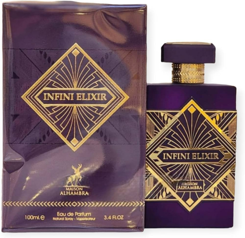Maison Alhambra Infini Elixir Edp 100 ml es una fragancia intensa y lujosa que combina notas principales de lavanda, vainilla, ámbar y maderas orientales, logrando un aroma dulce, amaderado y profundamente envolvente. Ideal para usarse de noche en otoño e invierno, esta fragancia proviene de Maison Alhambra, una reconocida casa de perfumería árabe.