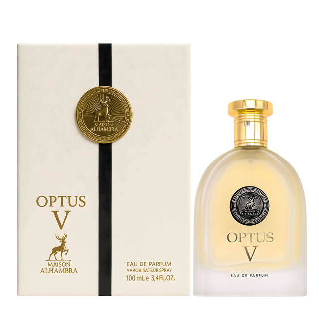Maison Alhambra Optus V EDP 100 ml es una fragancia unisex que combina raíz de lirio y ron en su apertura, un corazón de iris, jazmín y rosa, y un fondo de oud, notas amaderadas y civeta — ideal para quienes buscan un aroma sofisticado, profundo y versátil.