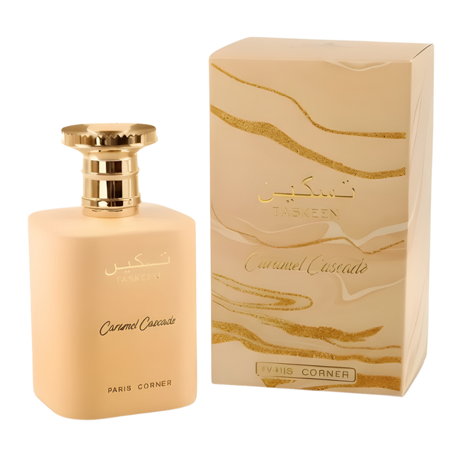 Paris Corner Taskeen Caramel Cascade EDP 100 ml es una fragancia envolvente y deliciosa que combina el dulzor del caramelo con toques cremosos de vainilla y maderas suaves. Ideal para quienes disfrutan aromas cálidos, elegantes y gourmand.